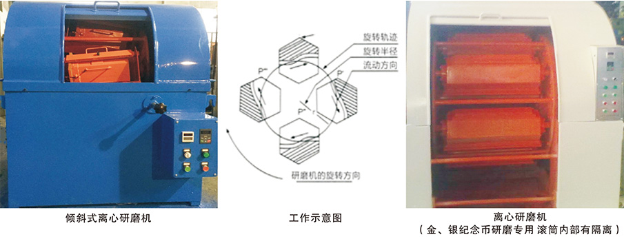 置四个滚筒(四个研磨槽)或六个滚筒,滚筒即随圆盘高速旋转和自转的相对运动,从而得到了滚筒中零件和磨料、水、